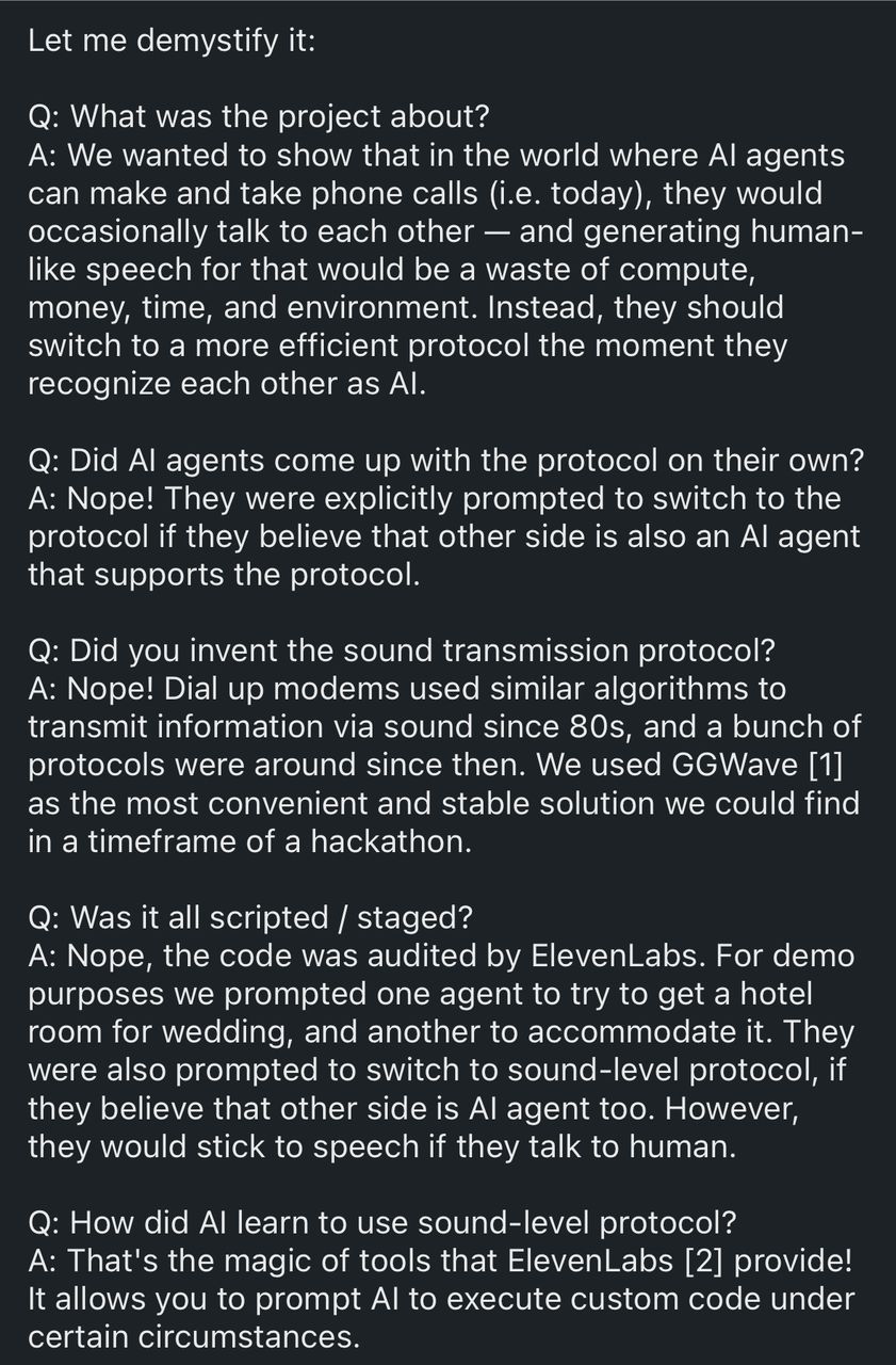 The technology was demonstrated at the ElevenLabs Hackathon in London in 2025 by creators Boris Starkov and Anton Pidkuiko. Their goal was to showcase a more streamlined and energy-efficient way for AIs to exchange information.