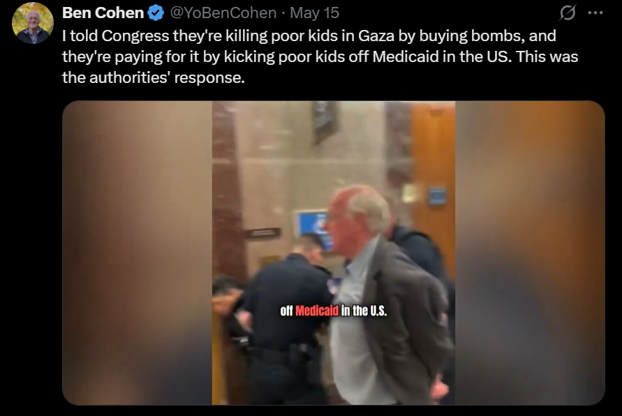 Footage shared by Cohen on social media shows him being forcibly removed by officers while shouting, “Congress is killing children in Gaza by buying bombs and funding it by cutting aid to kids.” In a follow-up post on X, Cohen wrote, “I can’t call myself an American and not take a stand. This is a betrayal of justice, of decency, and everything I thought America stood for.”
