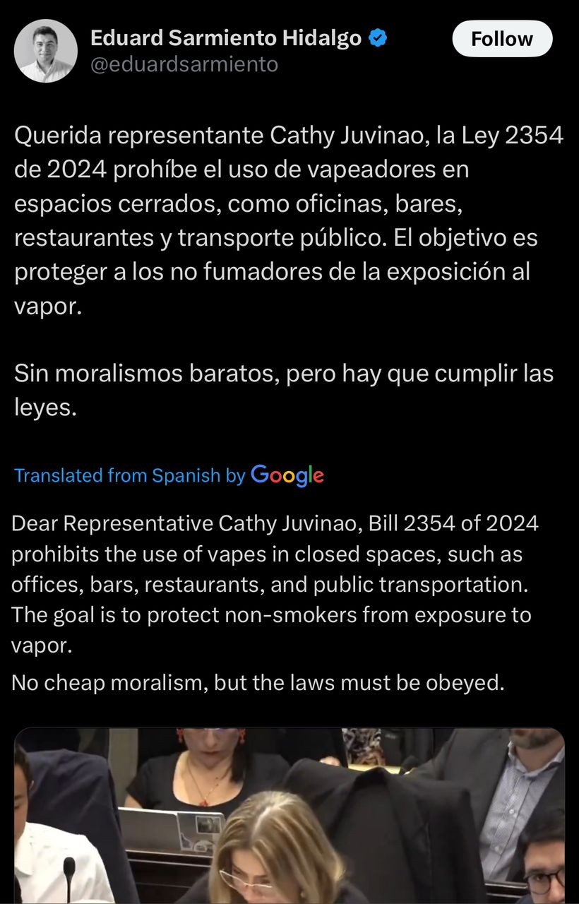 Representative Eduard Sarmiento also weighed in, referencing laws that ban vaping in public indoor spaces. “No cheap moralism, but the laws must be obeyed,” he emphasized on X.