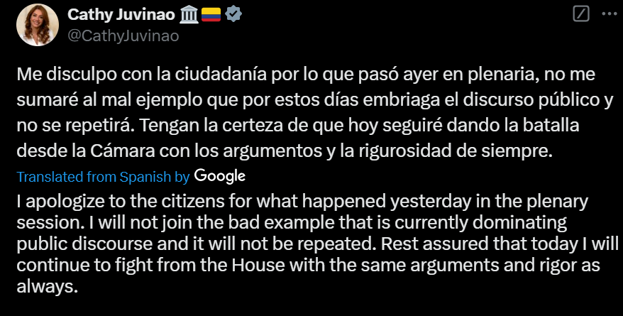 Juvinao wasted no time addressing the backlash. She issued an apology on X, taking responsibility for her actions and expressing regret for her behavior in such an important setting.