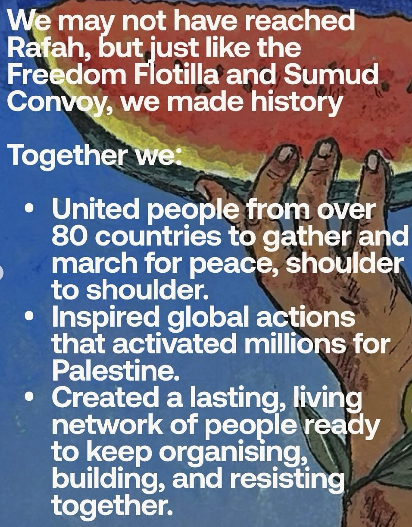 Although authorities physically stopped the march, its global impact continues to grow. Organisers pledge to continue the struggle—by land, air, sea, and solidarity—until Gaza’s gates open and justice prevails.