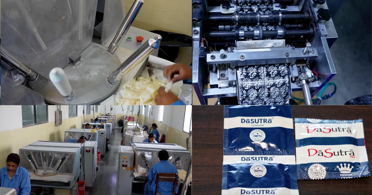 Footage from the facility in Maharashtra shows condoms being tested and packaged up. Aabha supplies the domestic Indian market, as well as Europe and other global regions. The representative also explained how crude oil byproducts were used in the foil packaging, the rubber itself and the lubricant.