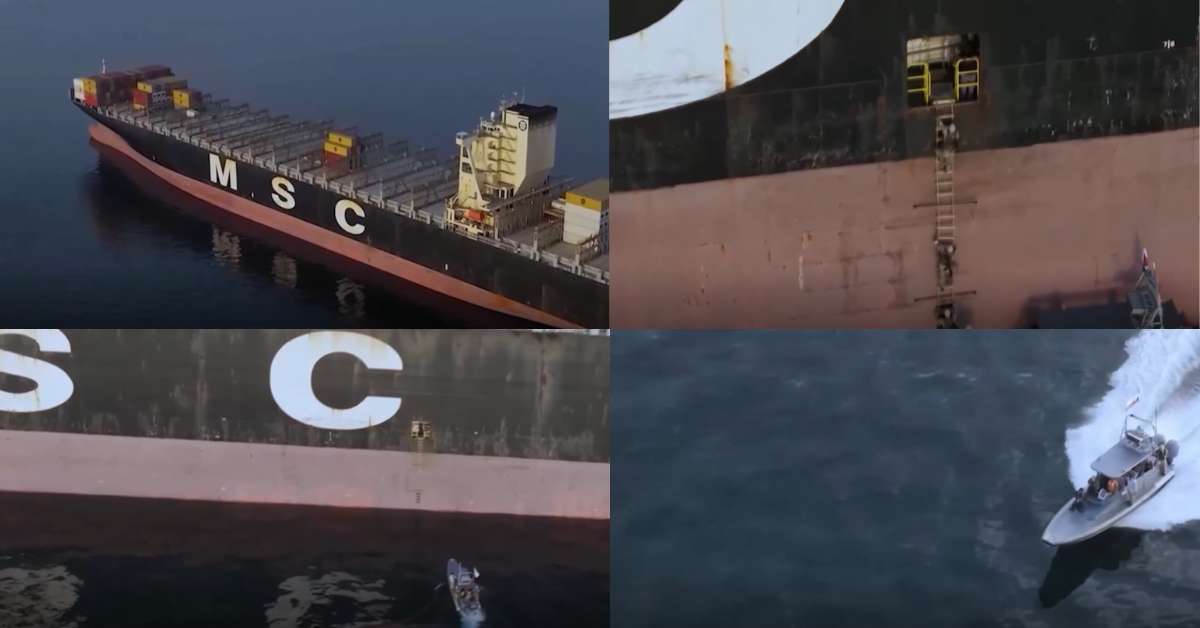 The video shows a small boat approaching a container ship before personnel climb aboard. The location and timing of the footage could not be independently verified.