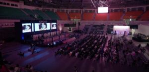 Footage shows dozens of fans cheering for their favourite players as they faced off on the stage of the Jinju Indoor Sports Complex.