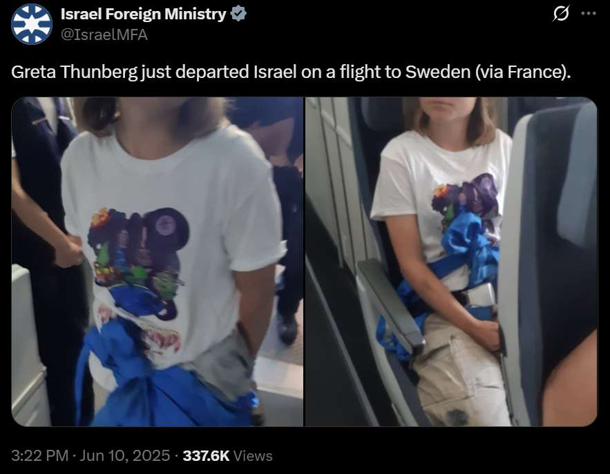 Swedish climate activist Greta Thunberg was one of 12 people detained during the operation. On June 10, she left Israel for Sweden via France after agreeing to voluntary deportation. Before her release, Thunberg posted a video accusing Israeli forces of abducting the group in international waters and urged global supporters to pressure their governments for action.