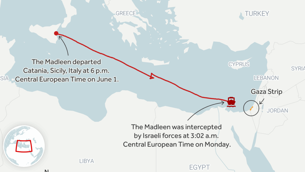 On June 9, Israeli naval forces intercepted The Madleen, a civilian vessel carrying humanitarian aid and international activists, roughly 185km from Gaza’s coastline. The boat, which had departed from Sicily on June 1, was part of the Freedom Flotilla Coalition’s (FFC) efforts to deliver baby formula, food, and medicine to the besieged Palestinian enclave.