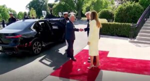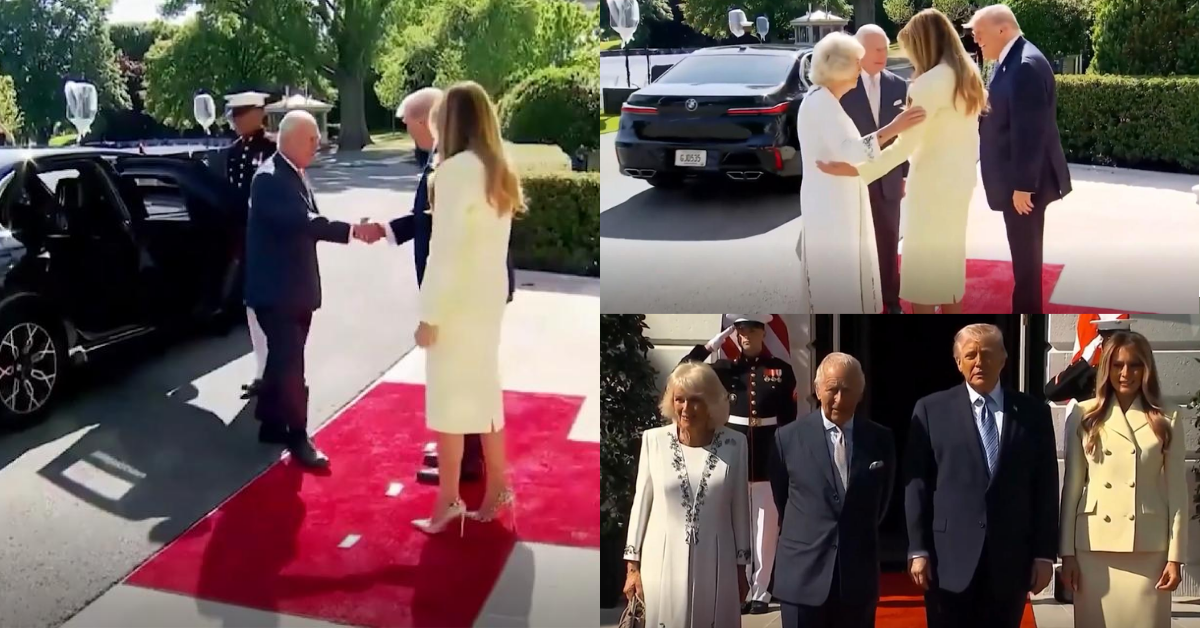 Footage shows Trump and First Lady Melania welcoming King Charles III and Queen Camilla with the two men locked in a prolonged handshake.