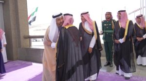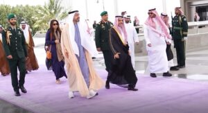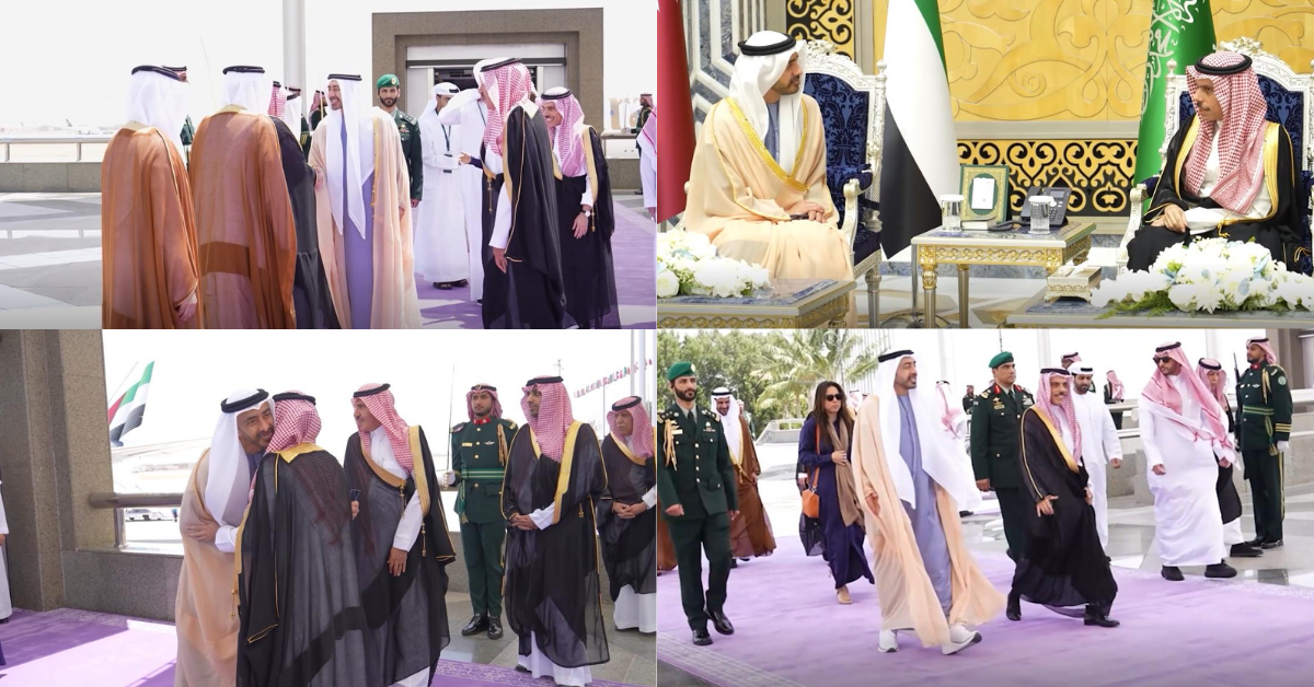 Footage shows Sheikh Abdullah being received by Saudi Foreign Minister Faisal bin Farhan Al Saud, before holding talks alongside delegations from both sides.