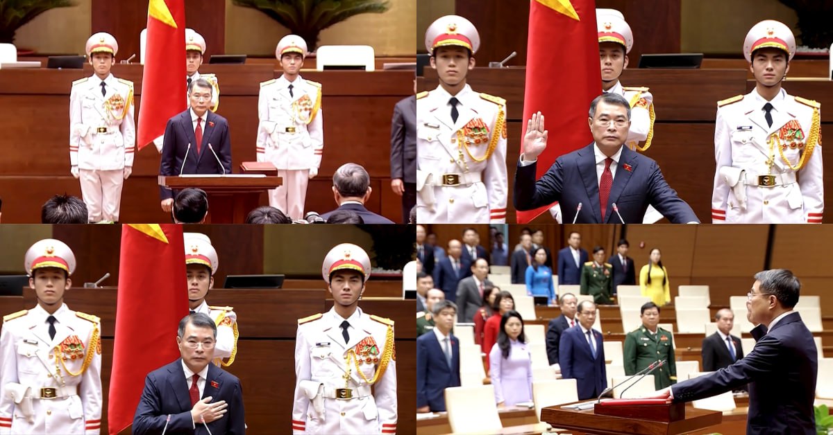 Footage shows Hung taking the oath before the National Assembly under Vietnam’s national flag.